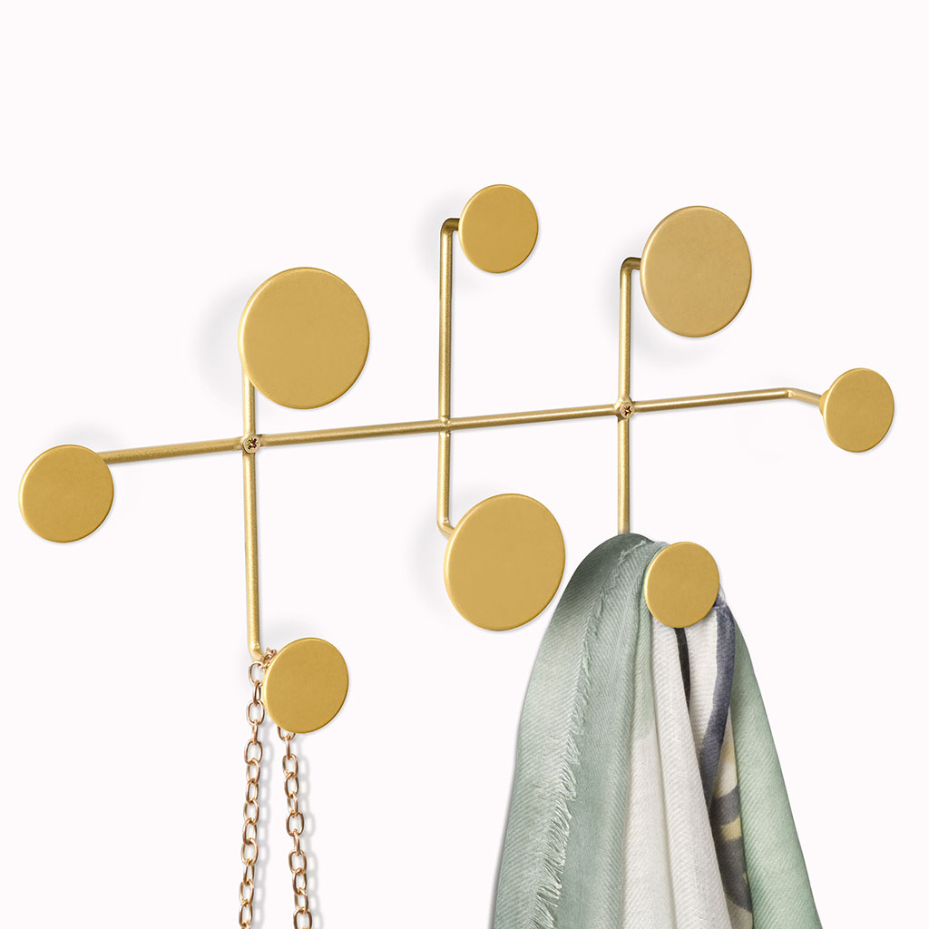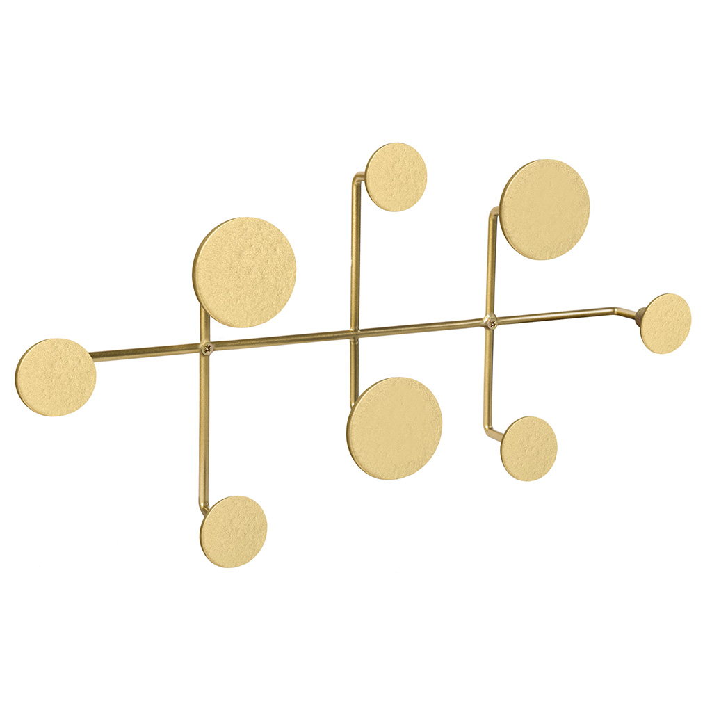 Deze goudkleurig metalen kapstok met 8 ronde kunststof knoppen is strak, speels en superhandig! De knoppen zitten op verschillende hoogtes, waardoor je makkelijk jassen, en tassen kwijt kunt – zonder dat alles over elkaar heenhangt! Ook perfect voor sjaals, hoeden of pettenen en sieraden! De kapstok wordt geleverd inclusief bevestigingsmateriaal.