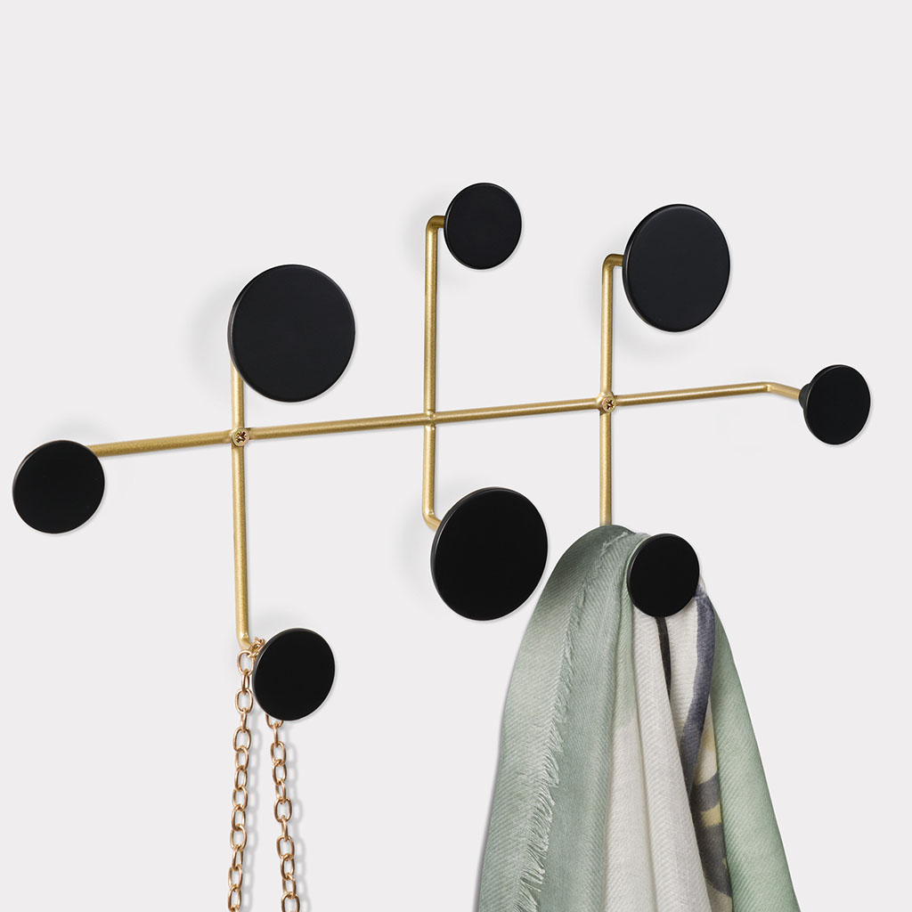 Deze goudkleurige metalen kapstok met 8 zwarte ronde kunststof knoppen is strak, speels en superhandig! De knoppen zitten op verschillende hoogtes, waardoor je makkelijk jassen, en tassen kwijt kunt – zonder dat alles over elkaar heenhangt! Ook perfect voor sjaals, hoeden of pettenen en sieraden! Inclusief beveestigingsmateriaal.
